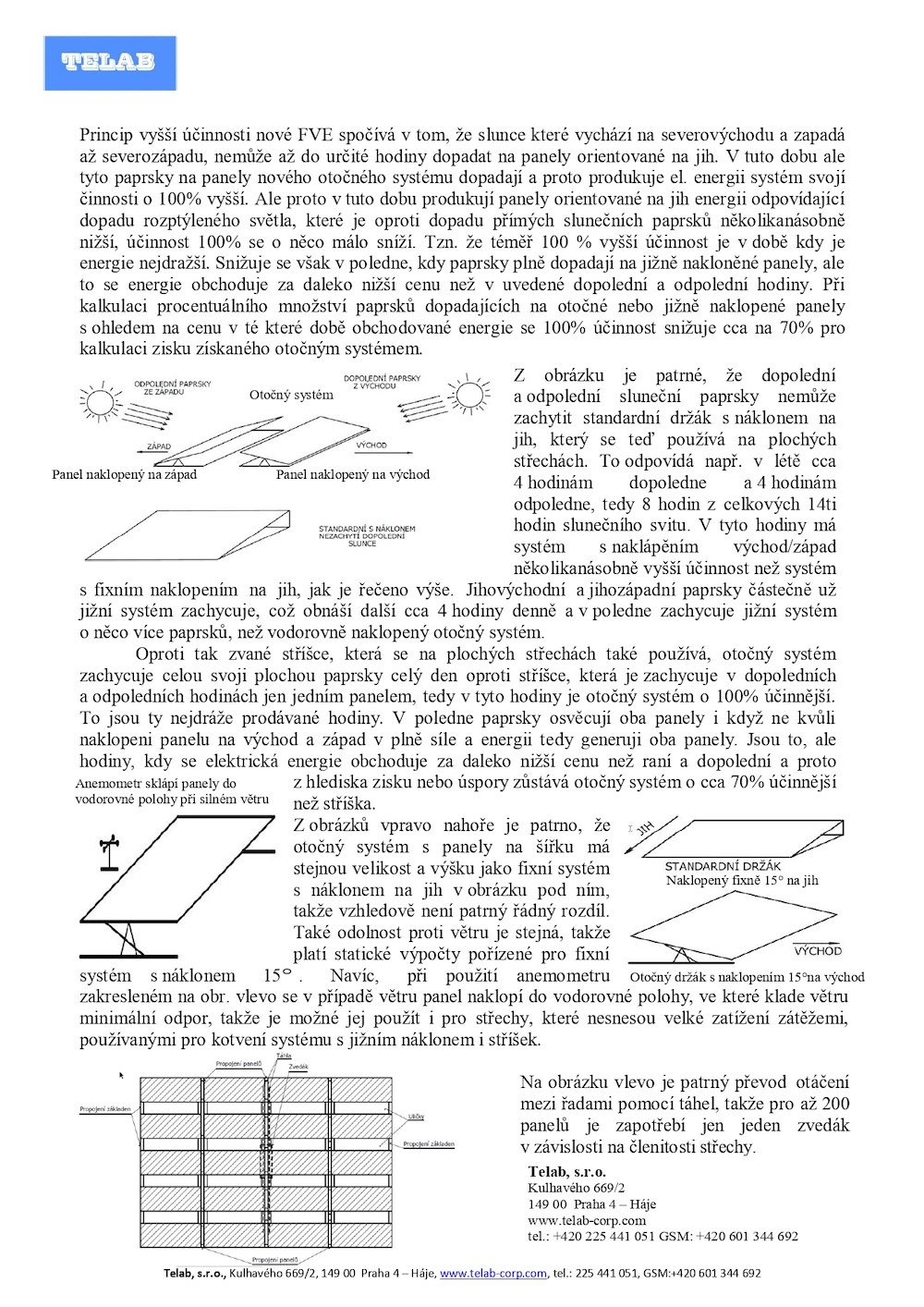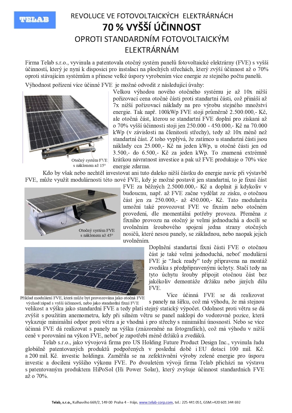 Telab jako vývojová firma pro US holding Future Product Design Inc. vyvinula řadu globálně patentovaných produktů, podpořených v poslední době i EU dotací ve výši 100 milionů Kč a 200 miliony vlastních investic holdingu. Zaměřila se na zefektivnění výroby zelené energie pro úsporu investic a docílení vyššího výkonu FVE. Po dvouletém vývoji firma Telab přichází na výstavu s patentovaným produktem HiPoSol (Hi Power Solar), který zvyšuje účinnost standardních FVE na plochých střechách až o 70 %, hlavně ráno a odpoledne, kdy je energie nejcennější a dobře prodejná.